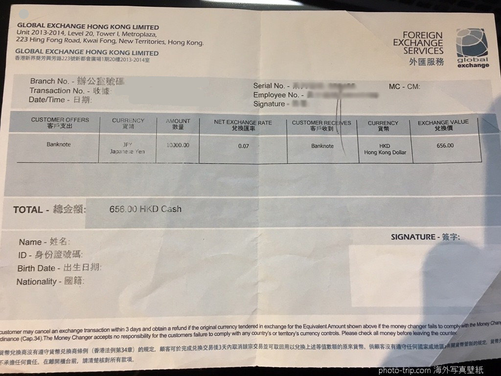 高速フェリーとは違い、マカオへのバスは随時運航しているため、ゆっくり香港ドル(HKD)への両替を済ませます。今回は香港への入国審査通過後にある空港の両替所で両替。10,000円が656HKDですから、レートは15.24。為替レートが約14.5でしたので、悪くないです。少なくとも日本の空港で両替して行くよりは遥かに良いレートです。両替時に500HKD札を渡されましたが、場所によってはお釣りが足りないという理由で使えない場合があるようで、使い勝手が悪そうだったので、100HKD札5枚に変えてもらいました。