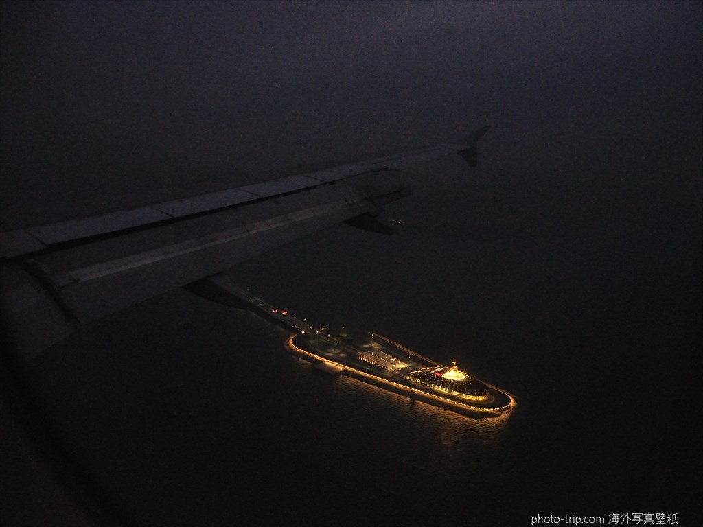 香港空港着陸直前に飛行機から見えたマカオへの高速道路の海中トンネルです。日本を出発してから、窓の外はほとんど海しか見えないため少々退屈です。でも、日本からは4時間程度なので、到着後の行動計画などをおさらいするには丁度良いぐらいの時間です。